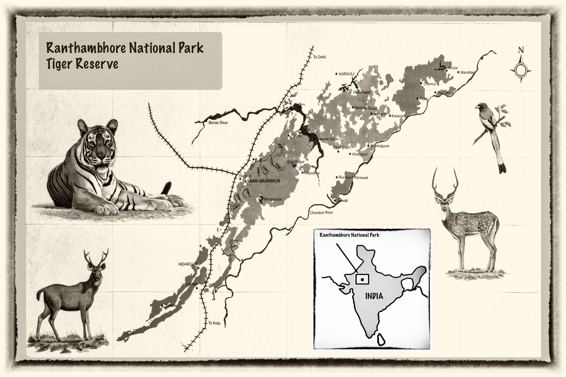 Ranthambore National Park is one of the biggest and most renowned national parks in Northern India. The park is located in the Sawai Madhopur district of southeastern Rajasthan, which is about 130 km from Jaipur.