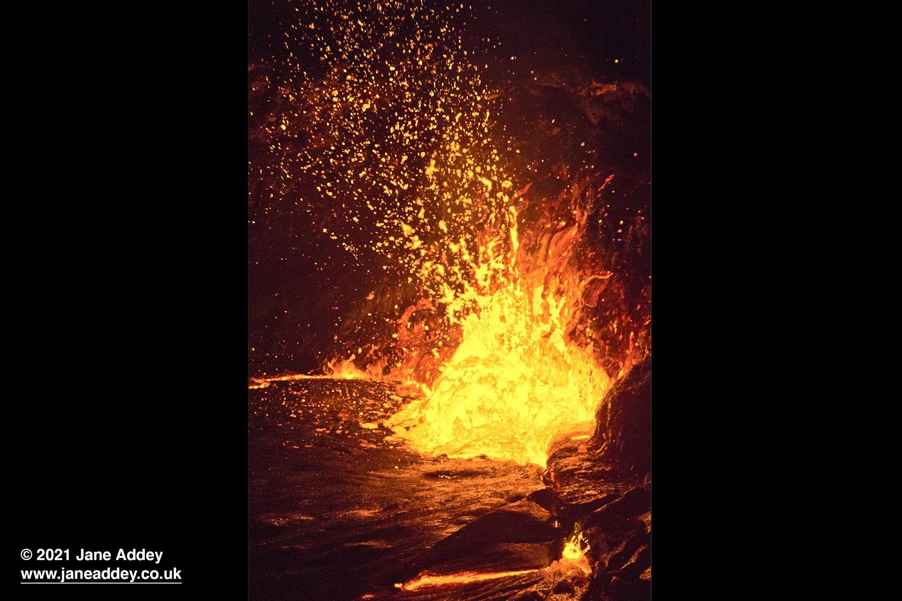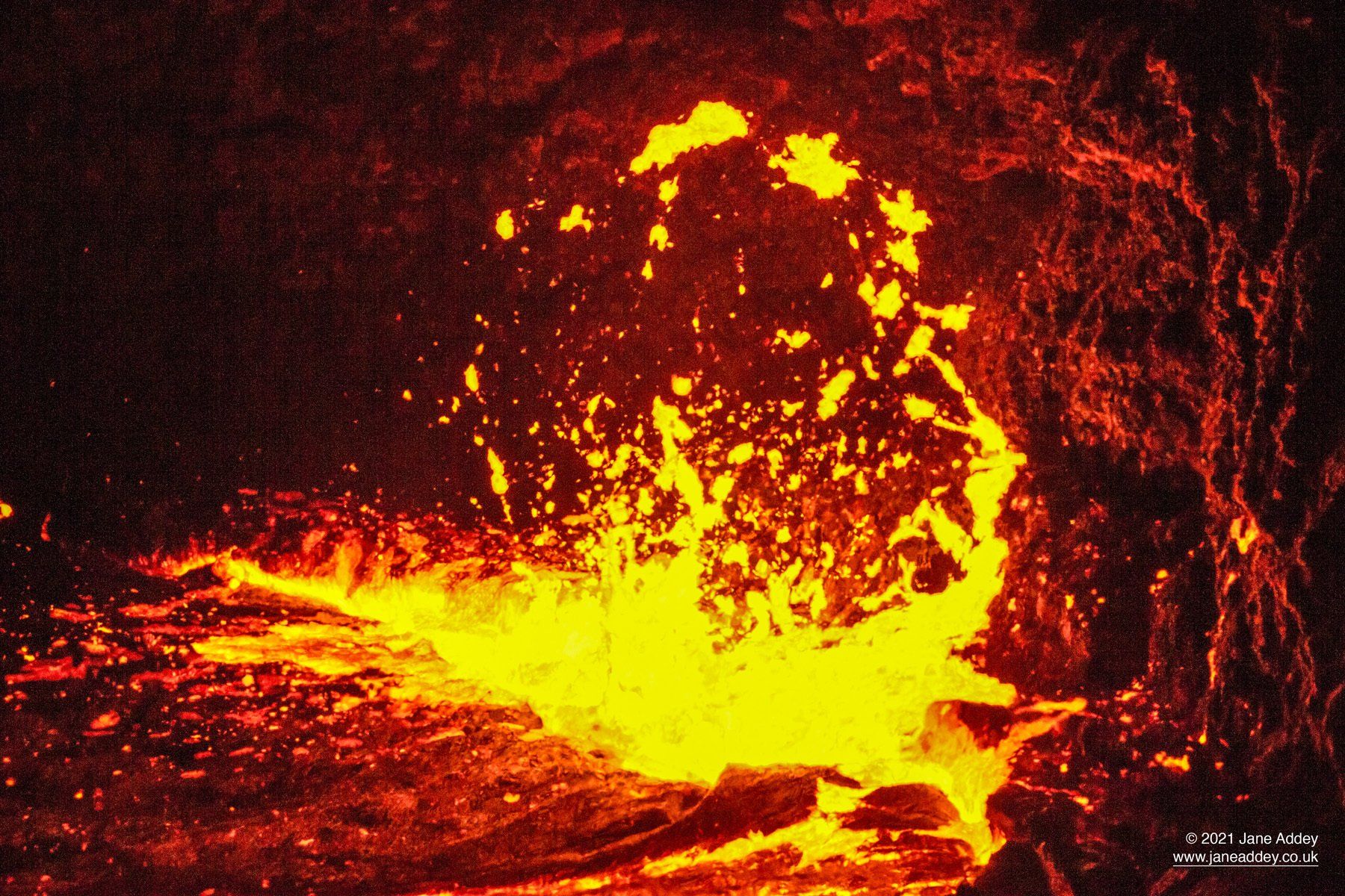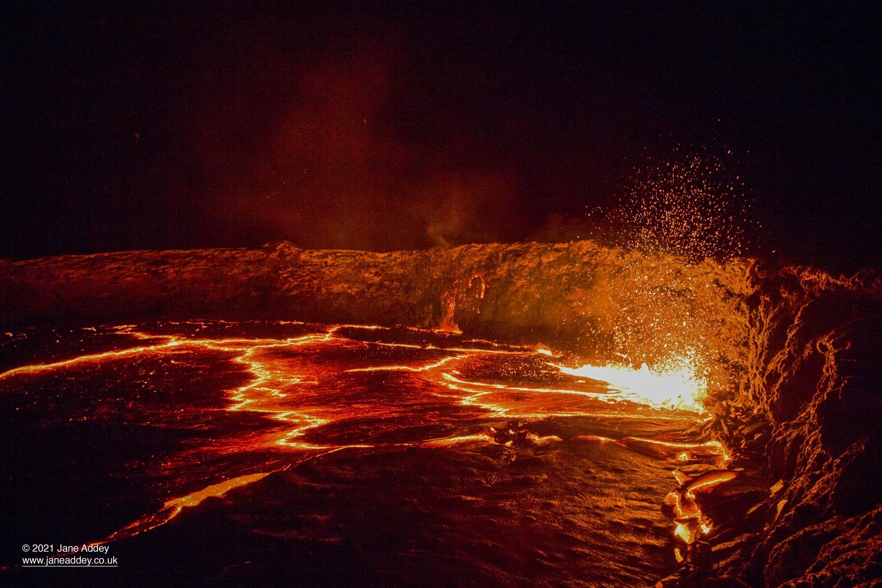 An eruption into the black sky released molten rock into the air. I was torn between taking photos, videos and just watching. Returning to the stone hut for a few hours’ sleep then up at ~5am the next morning and straight back down to the caldera. At one edge the volcano was very active. Lava exploded into the air, maybe 30-40 feet. Explosion after explosion, this activity went on for at least an hour and half. Sunrise was approaching and one could start to see the whole area of the caldera. The gruelling nature of this phase of the trip and the 20km round trek up and down the volcano was worth every moment of being in such challenging conditions.