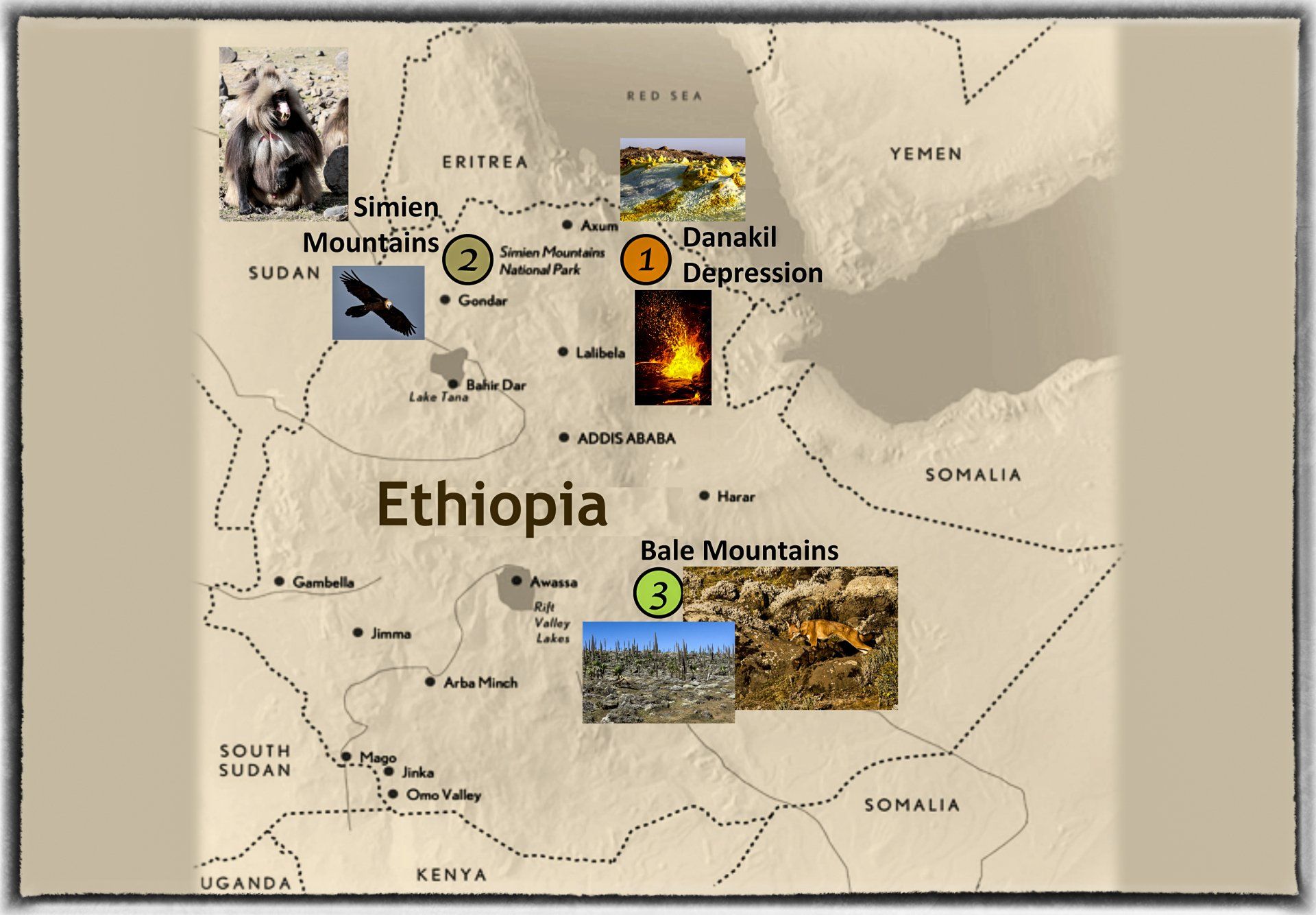 3) Bale Mountain National Park to primarily see the Ethiopian Wolves.